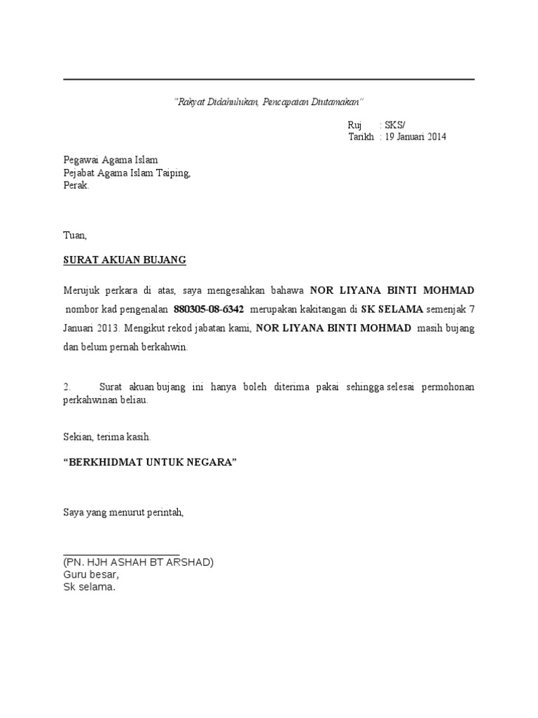 Contoh Surat Akuan Bujang Yang Ringkas Mudah from fuh.my Penerima surat (jabatan agama) nama individu; Kumpulan contoh surat akuan bujang daripada majikan yang baik dan benar 2019. That is the islamic marriage procedure. Kepada mereka mereka yang membuat pesuruhjaya sumpah bandar baru uda jb facebook. Contoh surat akuan bujang sabah. Home » unlabelled surat akuan bujang : Contoh surat pengesahan bujang dari ketua kampung. Academia edu is a platform for academics to share research papers.
